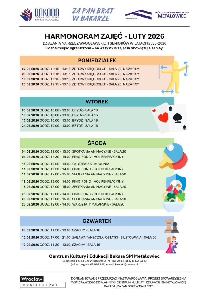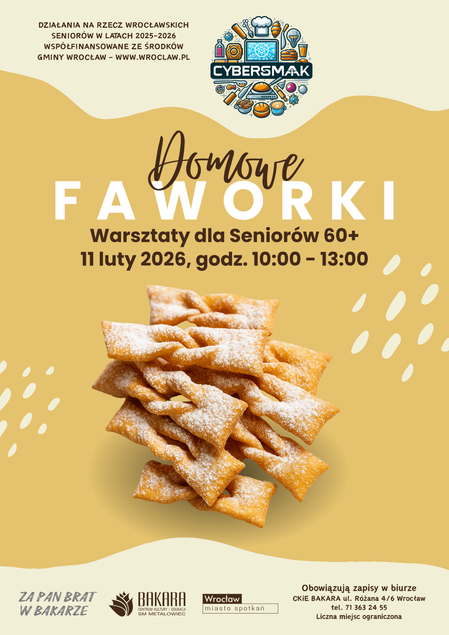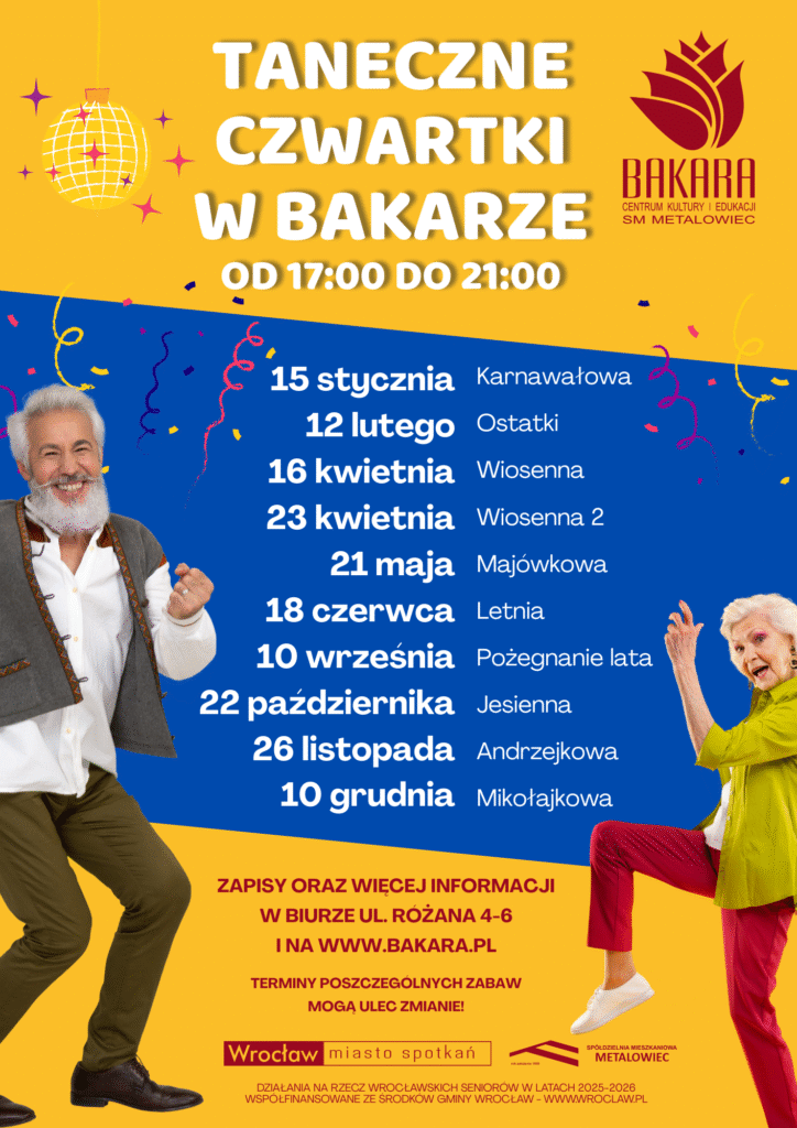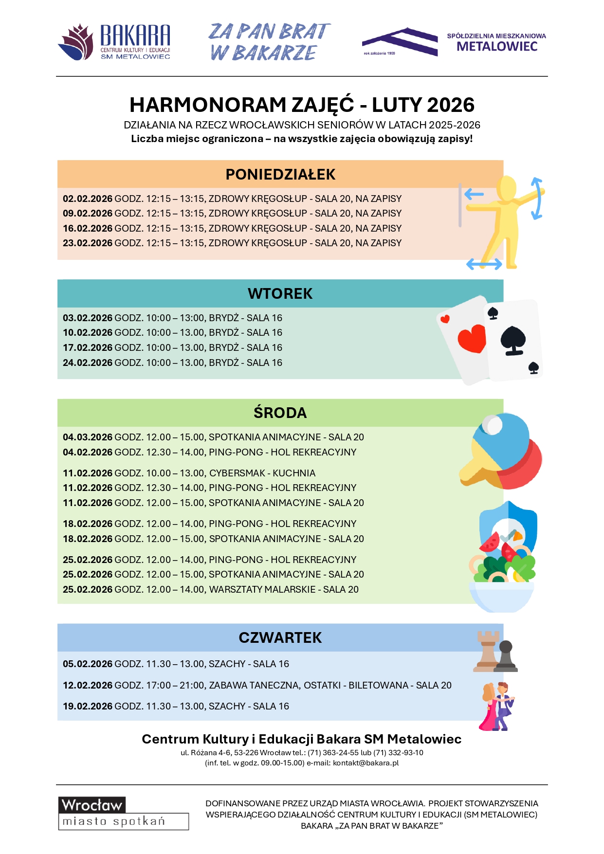 Projekt „Działania na rzecz wrocławskich seniorów w latach 2025-2026 – Za Pan Brat w Bakarze” jest realizowany przez Stowarzyszenie Wspierające Działalność CKiE (SM Metalowiec) „Bakara” i jest współfinansowany ze środków Gminy Wrocław, www.wroclaw.pl
